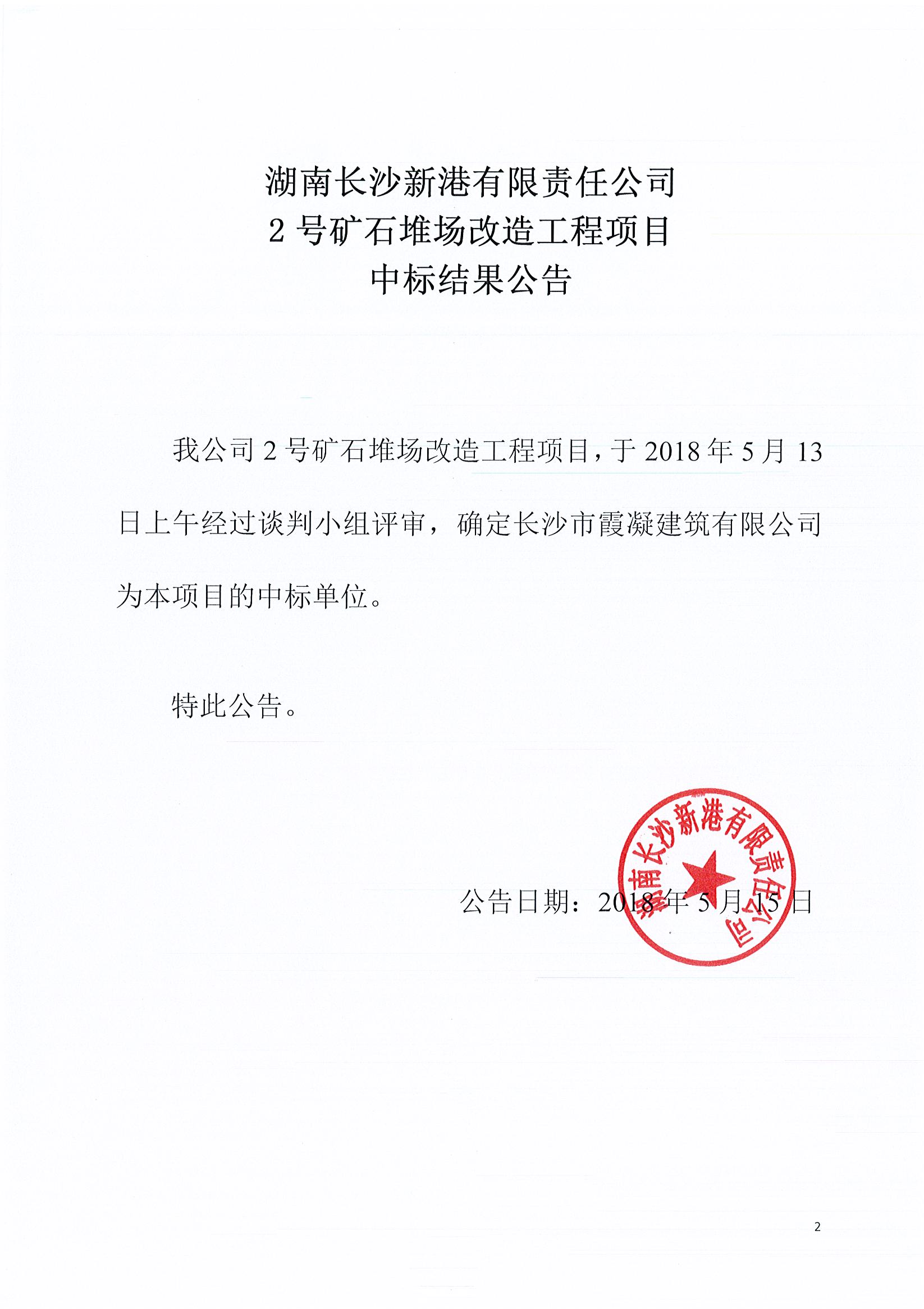 湖南長沙新港有限責(zé)任公司 2號礦石堆場改造工程項(xiàng)目中標(biāo)結(jié)果公告