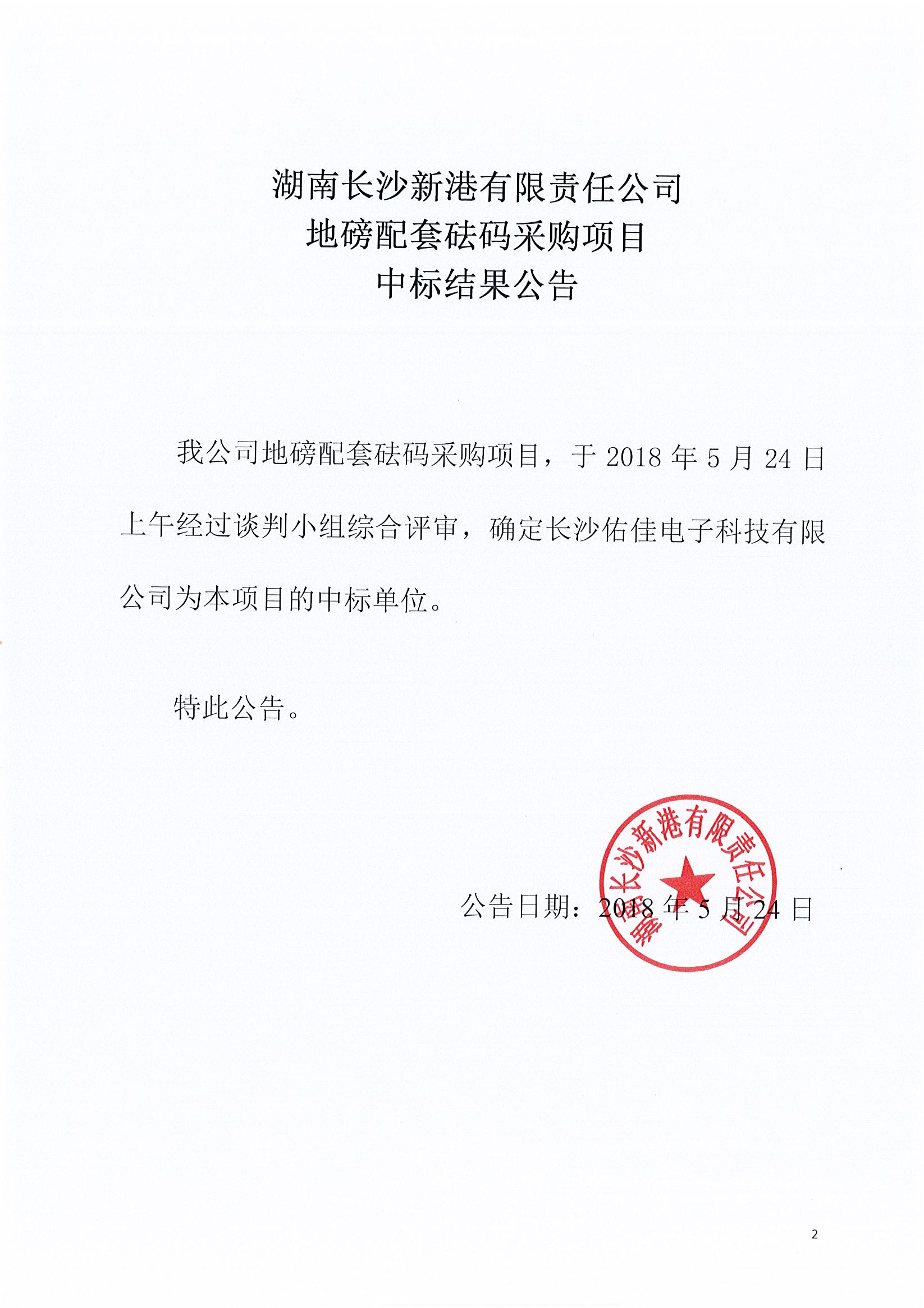 湖南長沙新港有限責任公司 地磅套砝碼采購項目中標結果公告