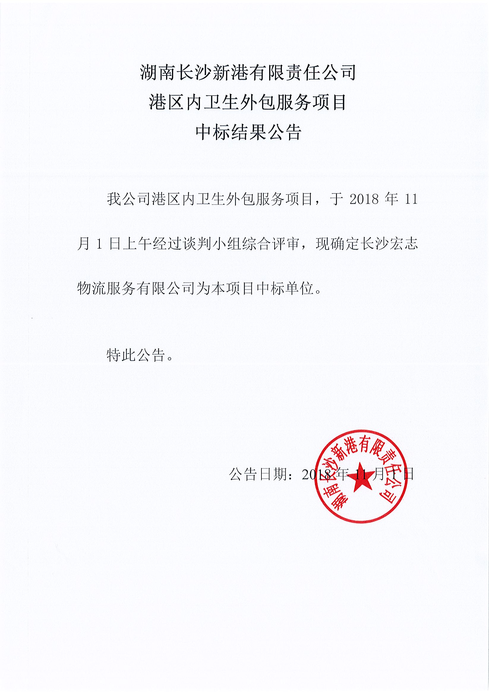 湖南長沙新港有限責(zé)任公司港區(qū)內(nèi)衛(wèi)生外包服務(wù)項目中標(biāo)結(jié)果公示