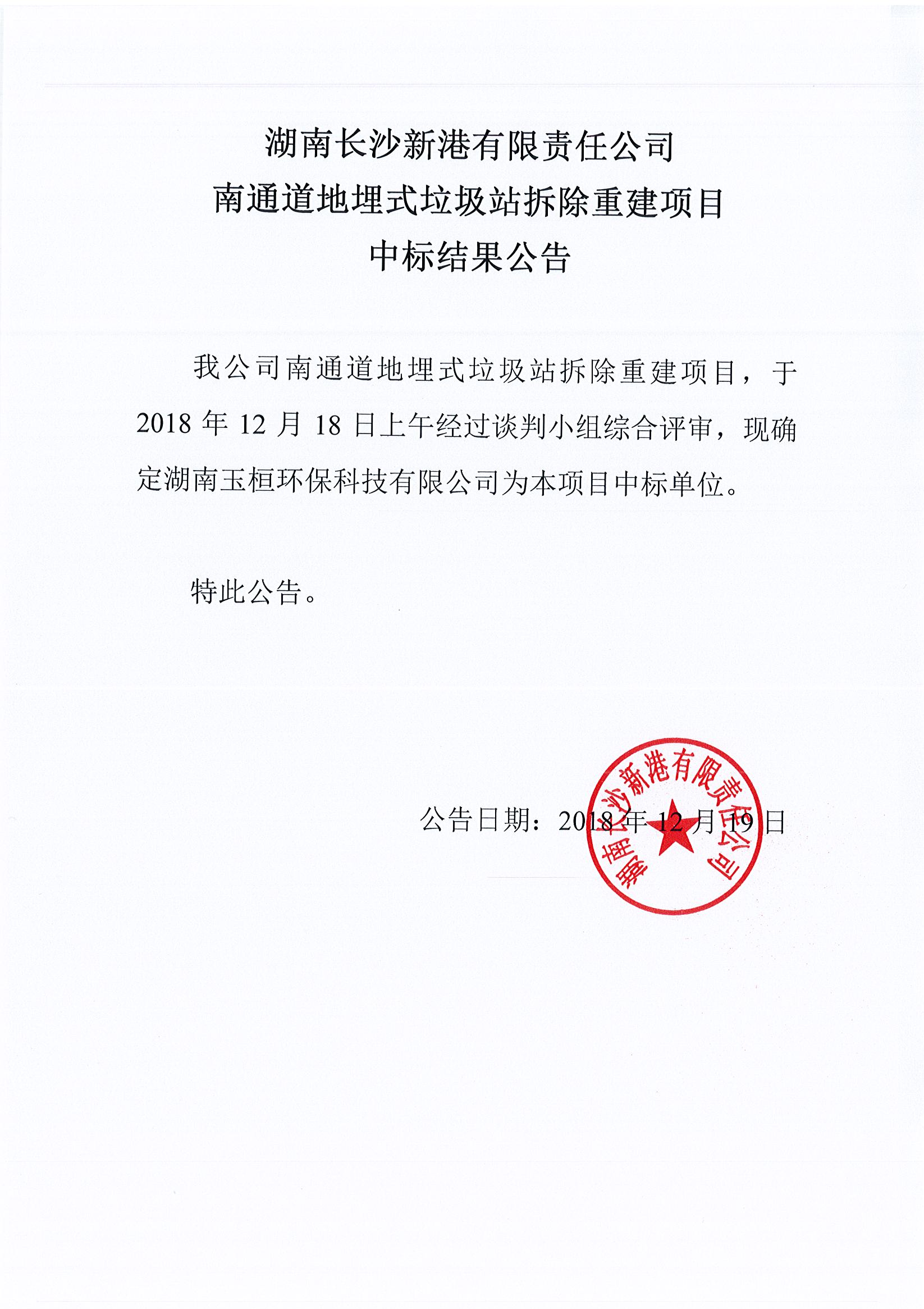 湖南長沙新港有限責(zé)任公司 南通道地埋式垃圾站拆除重建項目中標(biāo)公告