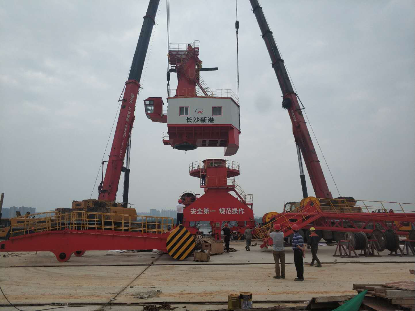 南片生產添助力 門座式起重機順利安裝 長沙港霞凝港區(qū)三期工程上游新建2000噸級(兼顧3000噸級)多用途泊位2個,滾裝泊位1個。滾裝泊位目前已完成土建實體、混凝土道路施工,配套鋼引橋制作安裝、躉船制安錨定及兩者的連接工作,已經具備投產條件;多用途泊位主體工程已基本完成,正在進行附屬工程掃尾工作。 長沙港霞凝港區(qū)三期工程上游多用途泊位計劃配置2臺門座式起重機;3月上旬,湖南中鐵五新重工有限公司港機安裝隊開始安裝,經過一個多月不懈努力,大車行走結構、轉臺、臂架、圓通門架等都已現(xiàn)場組裝完成。5月4日、6日,25t-25m、45t-25m門座式起重機順利完成轉臺及臂架等上部結構的合攏,主體結構一次性吊裝成功。在設備構件吊裝前,新港公司組織專家對吊裝方案的安全性進行了專家論證,確?蚣艽a頭承受荷載不大于設計荷載,以保證機械設備吊裝安全。