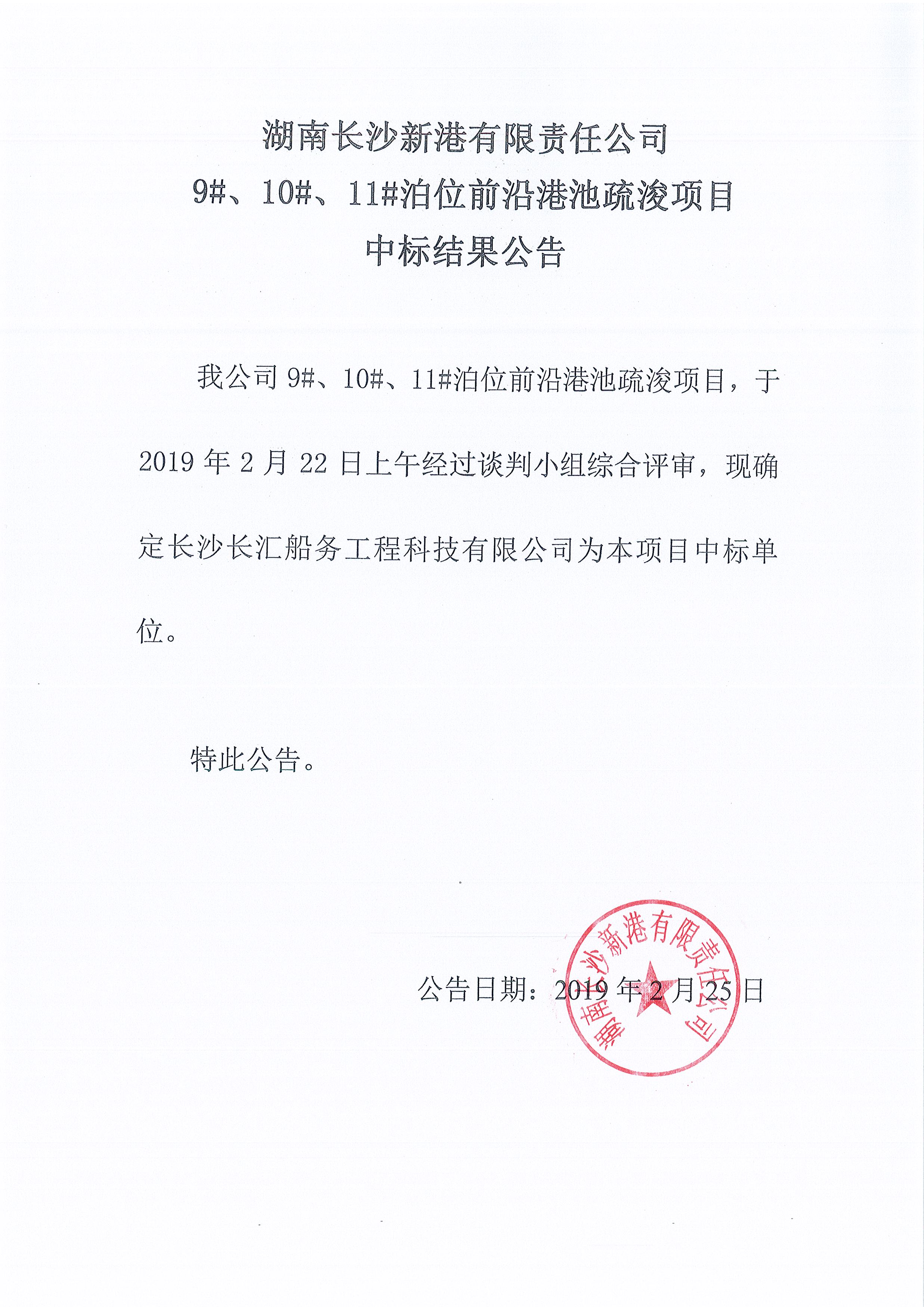 湖南長沙新港有限責任公司 9#、10#、11#泊位前沿港池疏浚項目中標結(jié)果公告