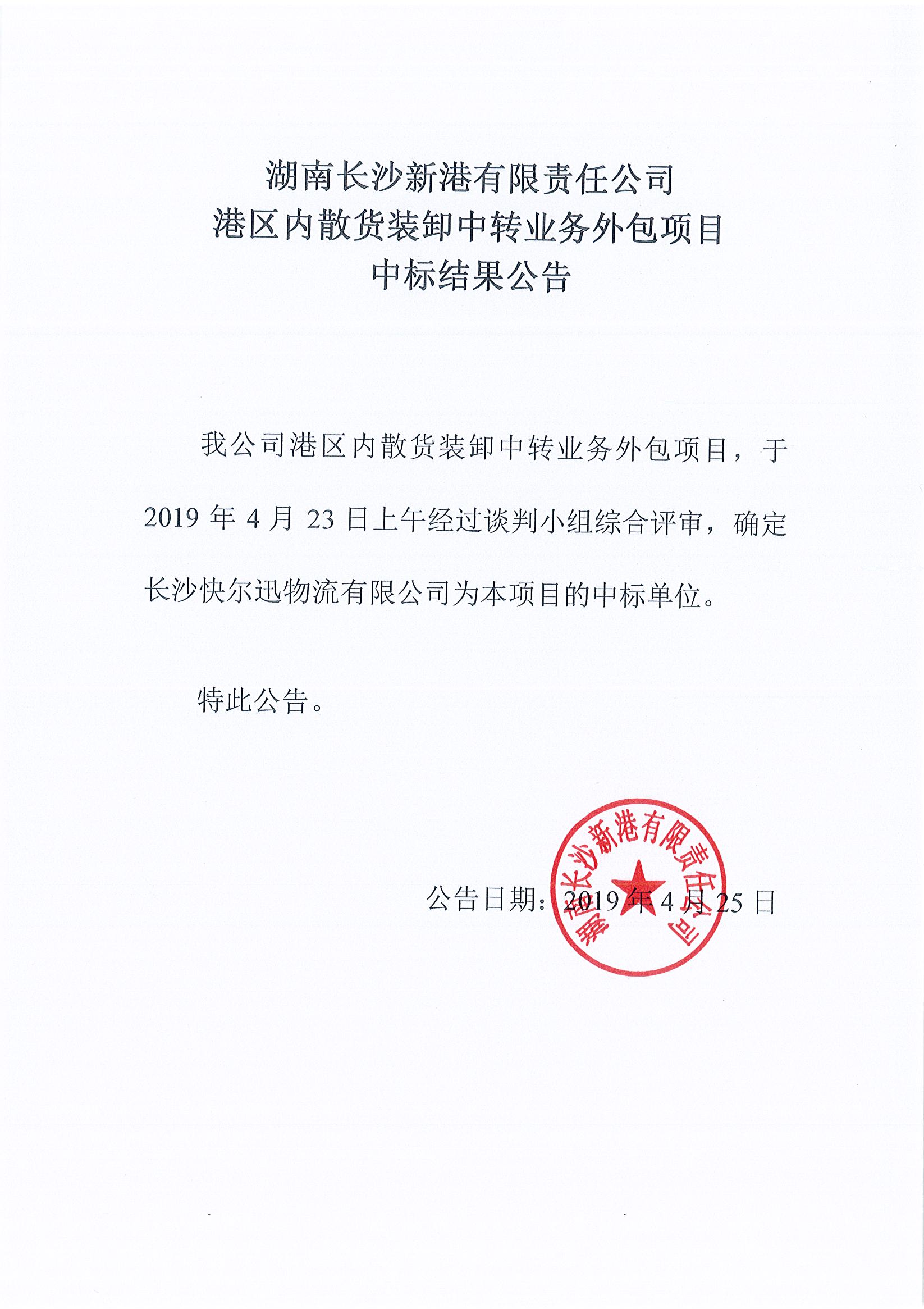 湖南長(zhǎng)沙新港有限責(zé)任公司港區(qū)內(nèi)散貨裝卸中轉(zhuǎn)業(yè)務(wù)外包項(xiàng)目中標(biāo)結(jié)果公告