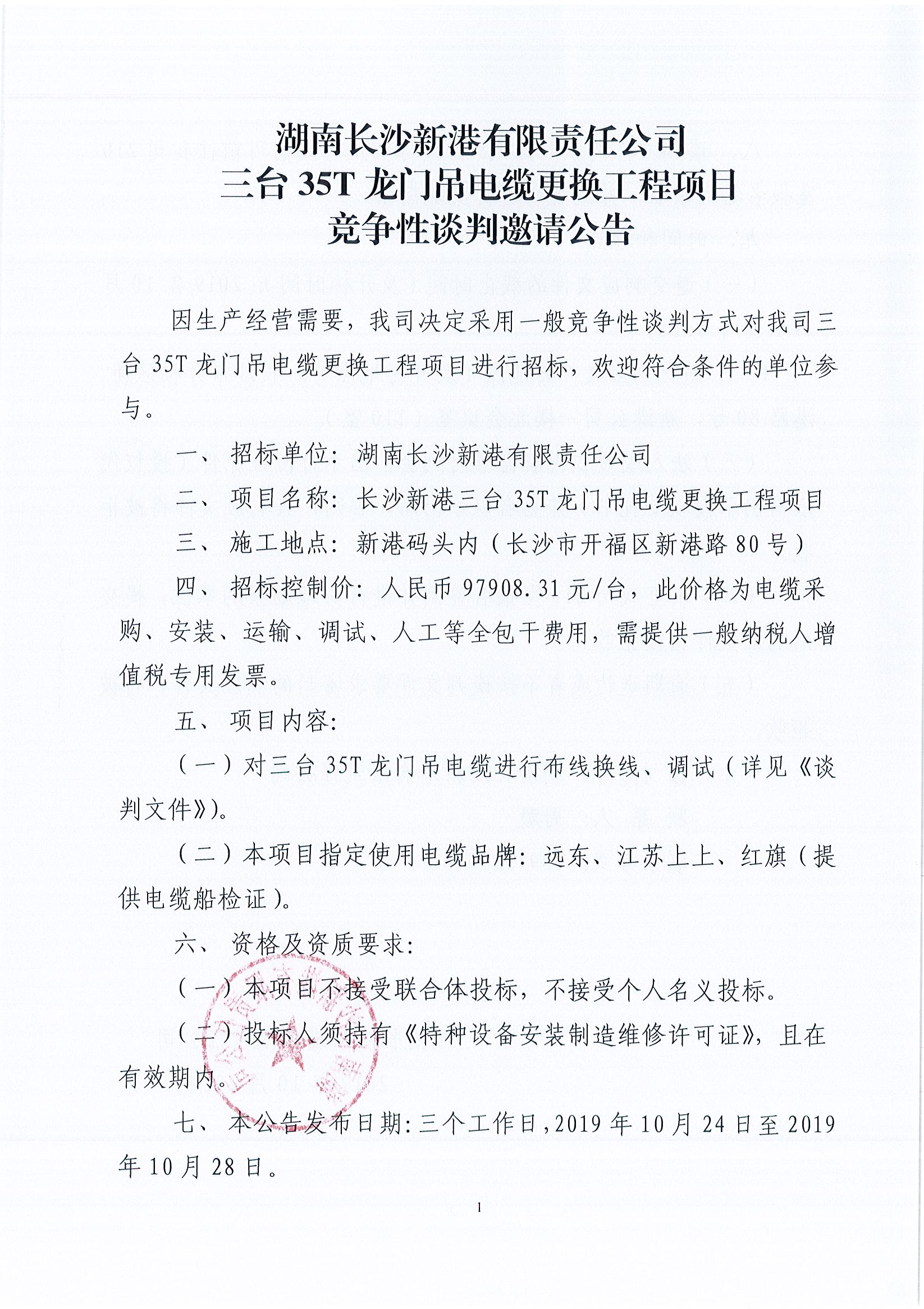 湖南長(zhǎng)沙新港有限責(zé)任公司三臺(tái)35T龍門吊電纜更換工程項(xiàng)目競(jìng)爭(zhēng)性談判邀請(qǐng)公告