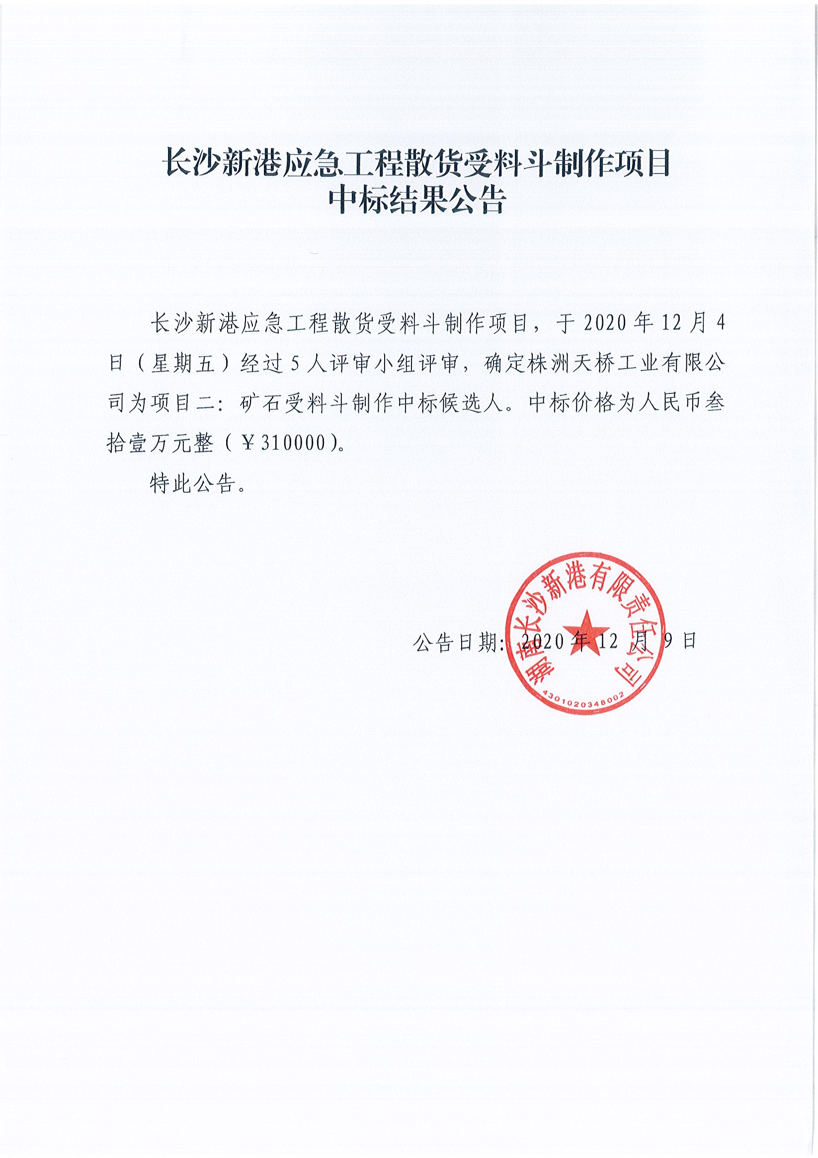 長(zhǎng)沙新港應(yīng)急工程散貨受料斗制作項(xiàng)目中標(biāo)結(jié)果公告
