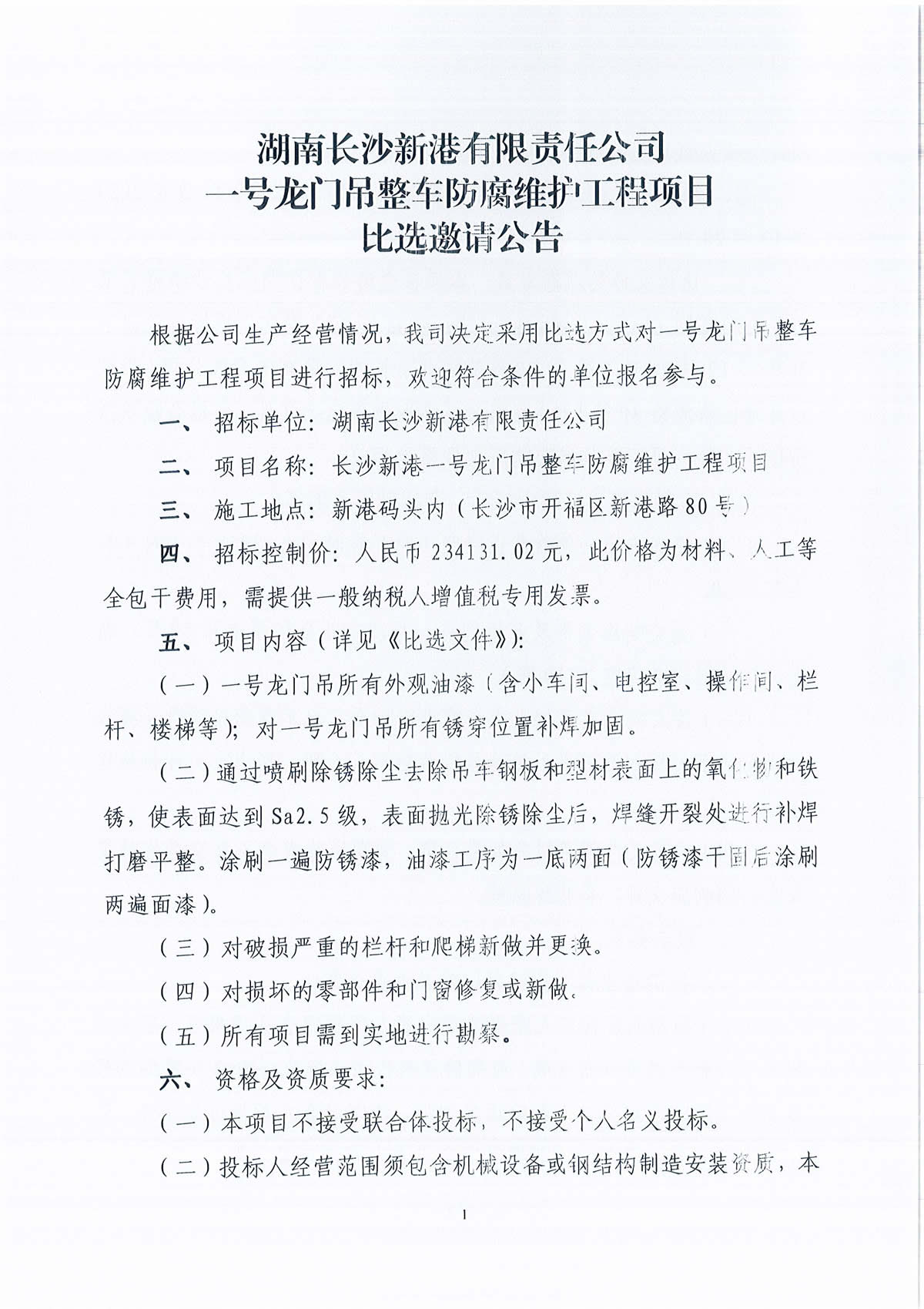 湖南長(zhǎng)沙新港有限責(zé)任公司一號(hào)龍門吊整車防腐維護(hù)工程項(xiàng)目比選邀請(qǐng)公告