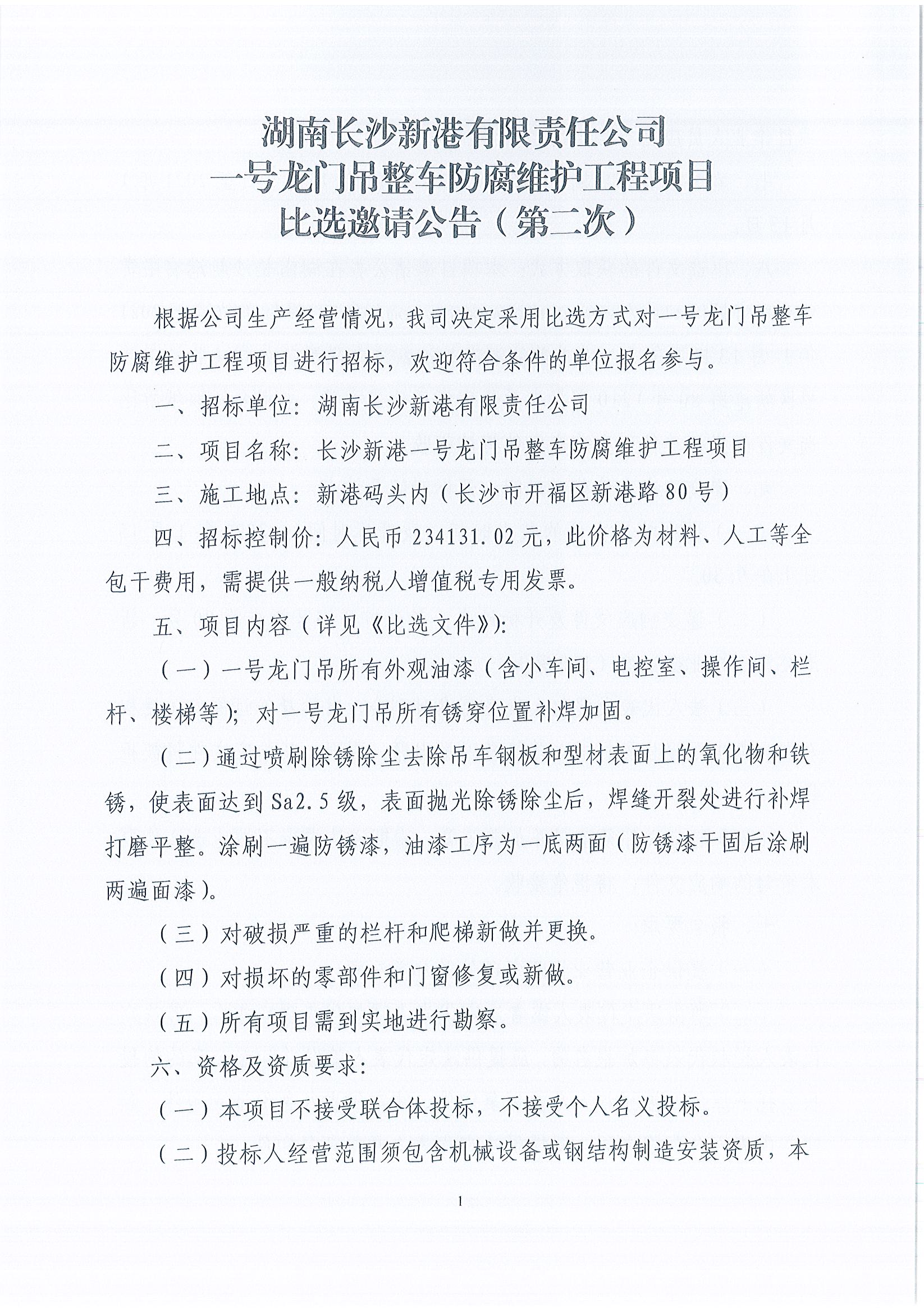 湖南長(zhǎng)沙新港有限責(zé)任公司一號(hào)龍門(mén)吊整車防腐維護(hù)工程比選邀請(qǐng)公告(第二次)