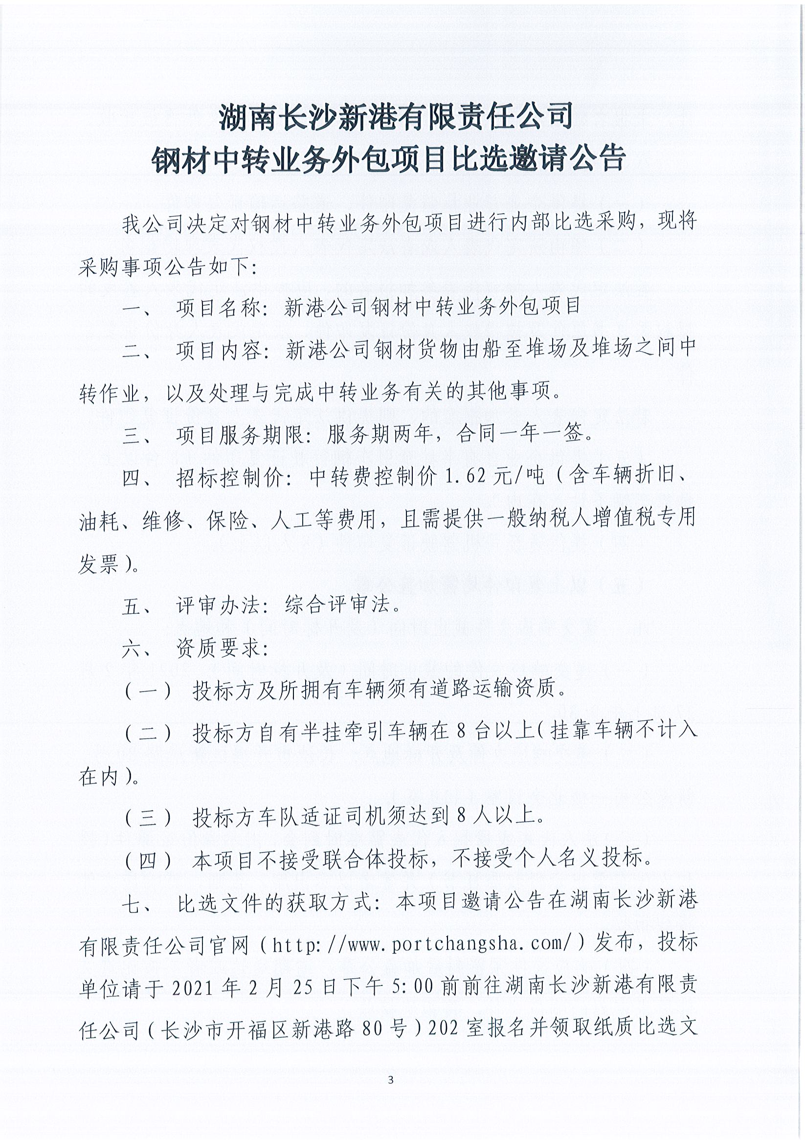湖南長(zhǎng)沙新港有限責(zé)任公司鋼材中轉(zhuǎn)業(yè)務(wù)外包項(xiàng)目比選邀請(qǐng)公告