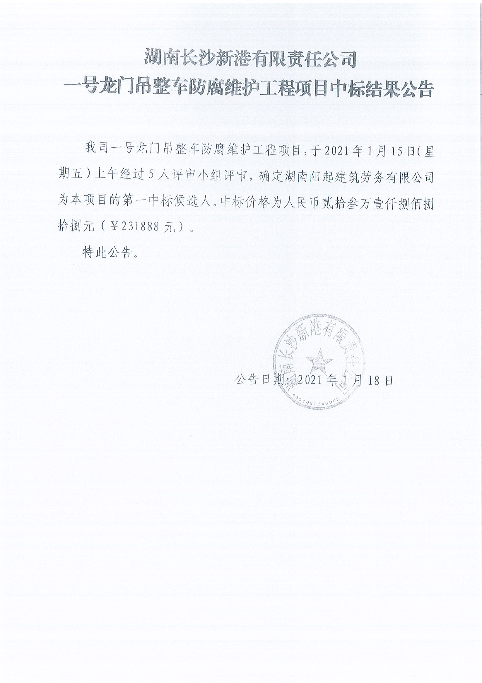 湖南長(zhǎng)沙新港有限責(zé)任公司一號(hào)龍門吊整車防腐維護(hù)工程項(xiàng)目中標(biāo)結(jié)果公告