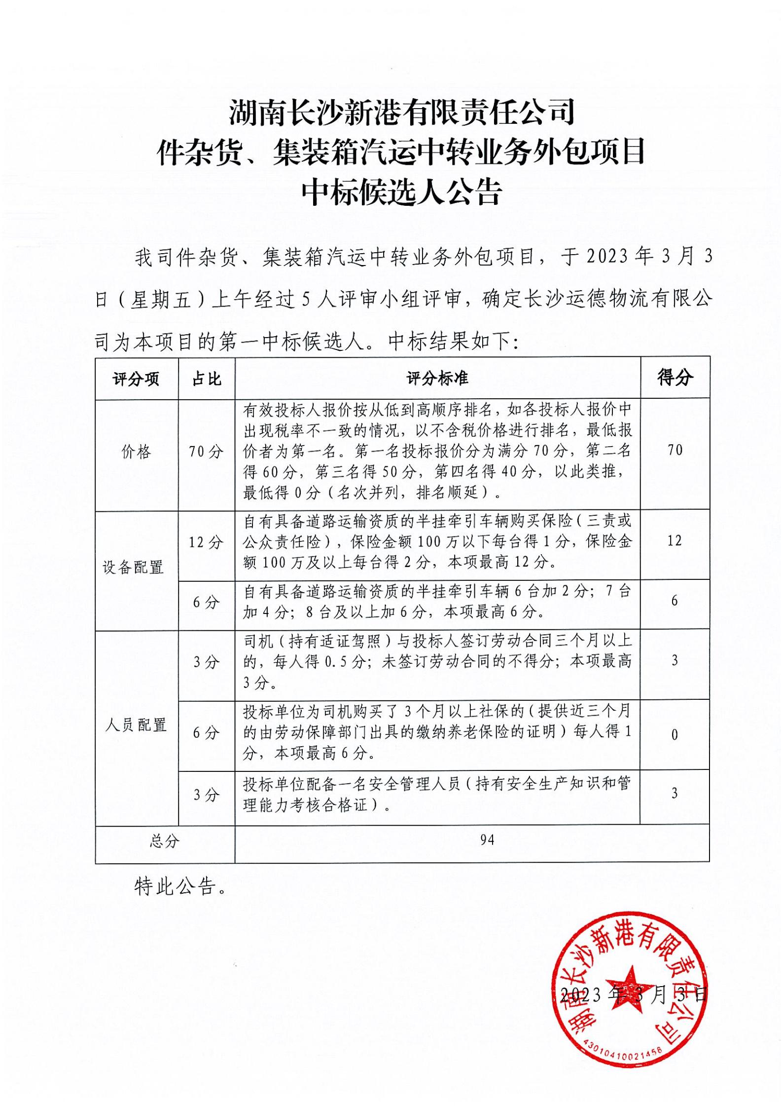 湖南長(zhǎng)沙新港有限責(zé)任公司件雜貨、集裝箱汽運(yùn)中轉(zhuǎn)業(yè)務(wù)外包項(xiàng)目中標(biāo)候選人公告