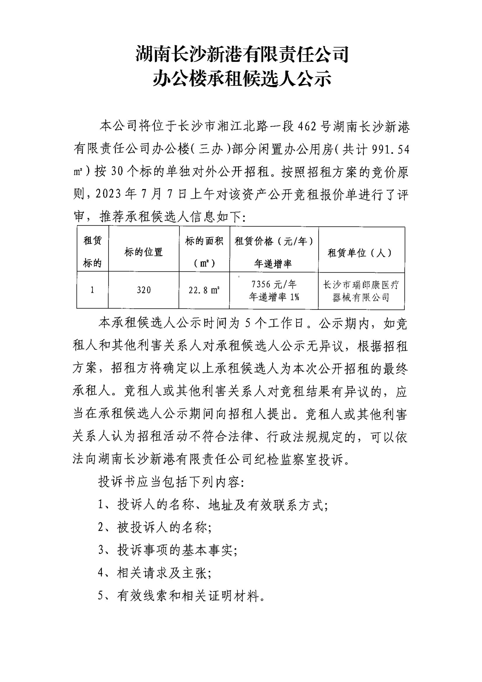 湖南長(zhǎng)沙新港有限責(zé)任公司辦公樓承租候選人公示(320)