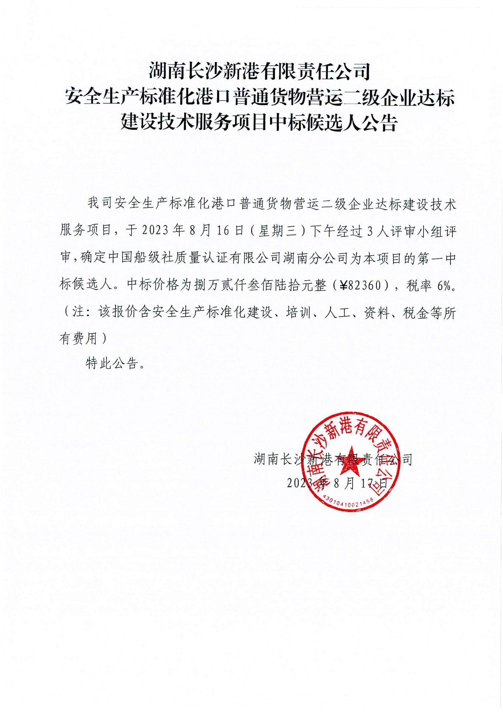 安全生產標準化港口普通貨物營運二級企業(yè)達標建設技術服務項目中標候選人公告