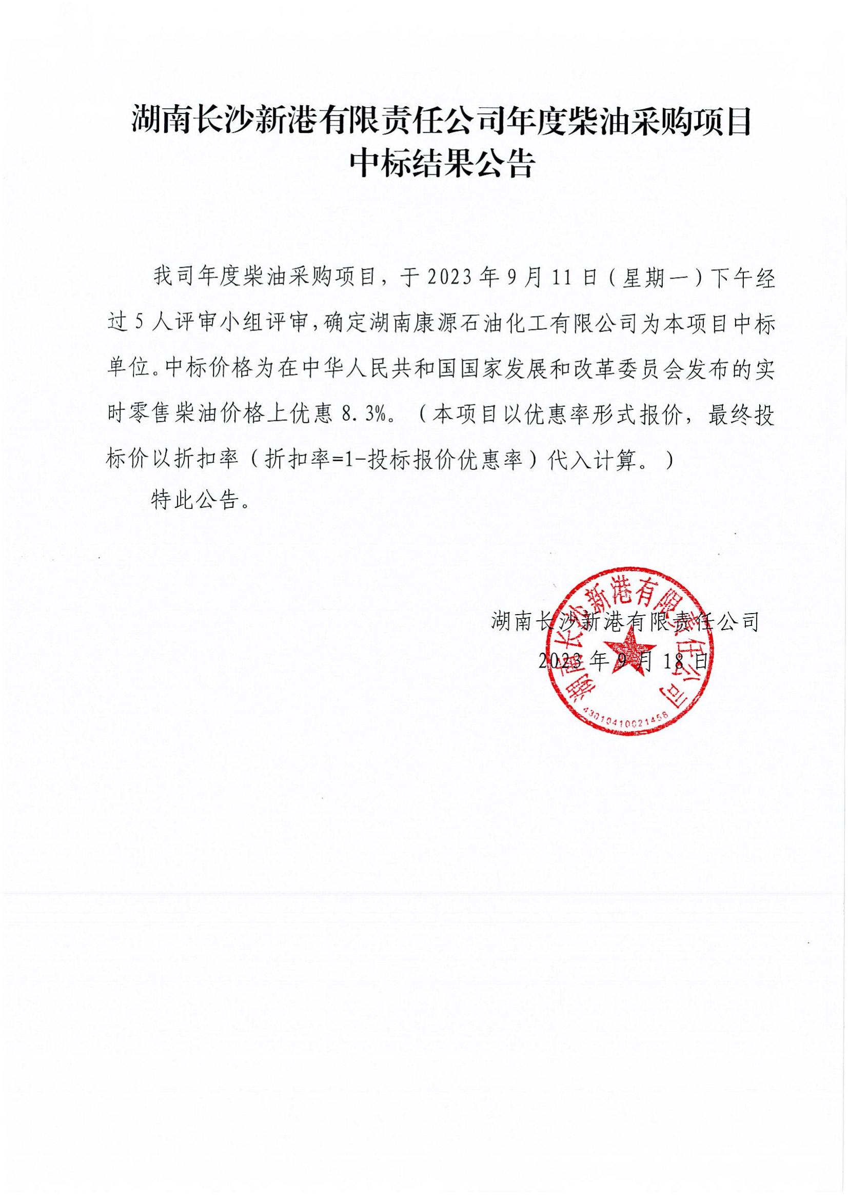 湖南長沙新港有限責(zé)任公司年度柴油項目中標(biāo)結(jié)果公告