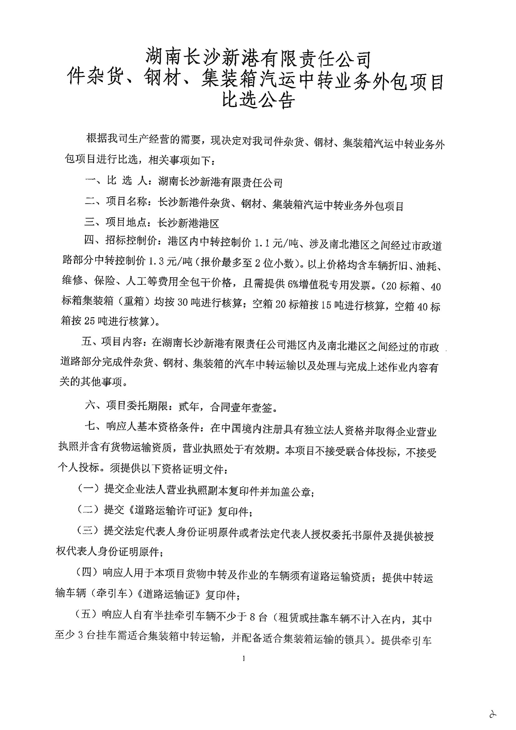長沙新港件雜貨、鋼材、集裝箱汽運中轉(zhuǎn)業(yè)務(wù)外包項目比選公告
