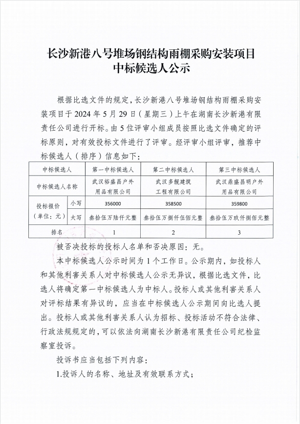 長(zhǎng)沙新港八號(hào)堆場(chǎng)鋼結(jié)構(gòu)雨棚采購(gòu)安裝項(xiàng)目中標(biāo)候選人公示